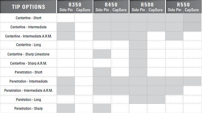 POINTES EFFILÉES POUR CALCAIRE » Pointes centrales intermédiaires, effilées pour former une extrémité pointue » Bande ARM sur un côté améliorant l’action d’affûtage » Offrent la meilleure pénétration et contiennent 13 % plus de matériel d’usure que les pointes centrales courtes |