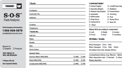 For the fastest turnaround, please drop your samples at any one of our branch locations and Toromont will expedite them to our lab for you. View branch locations »